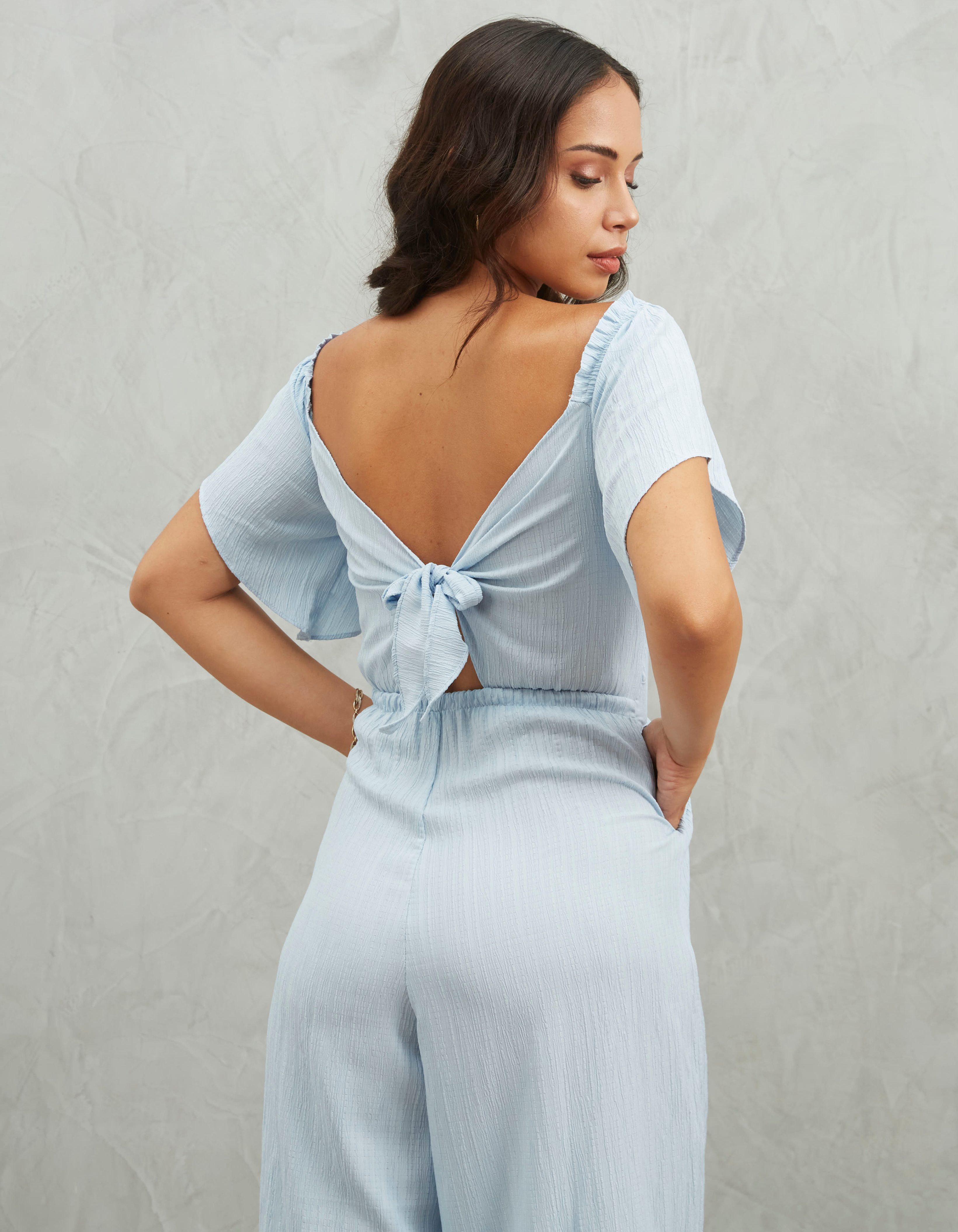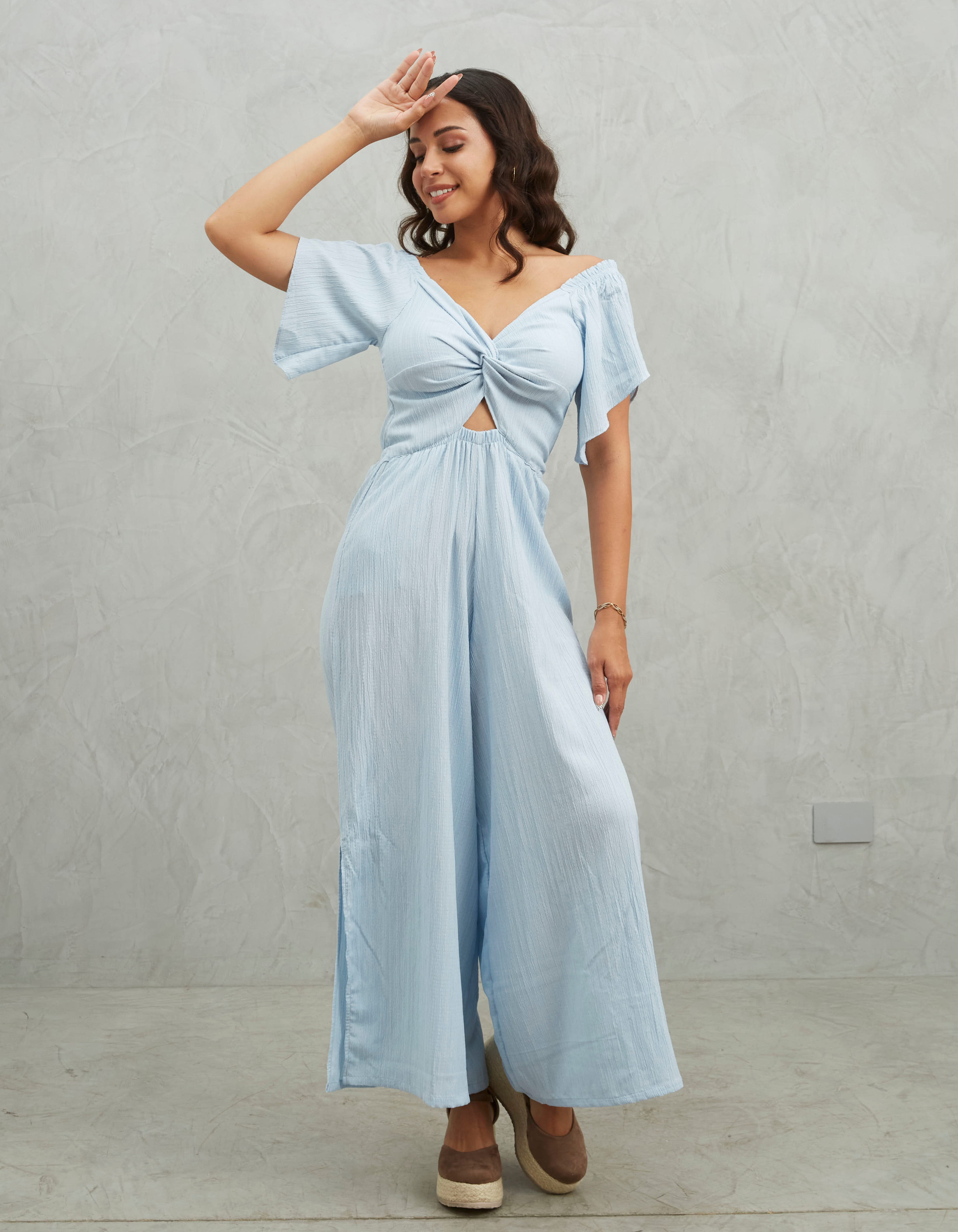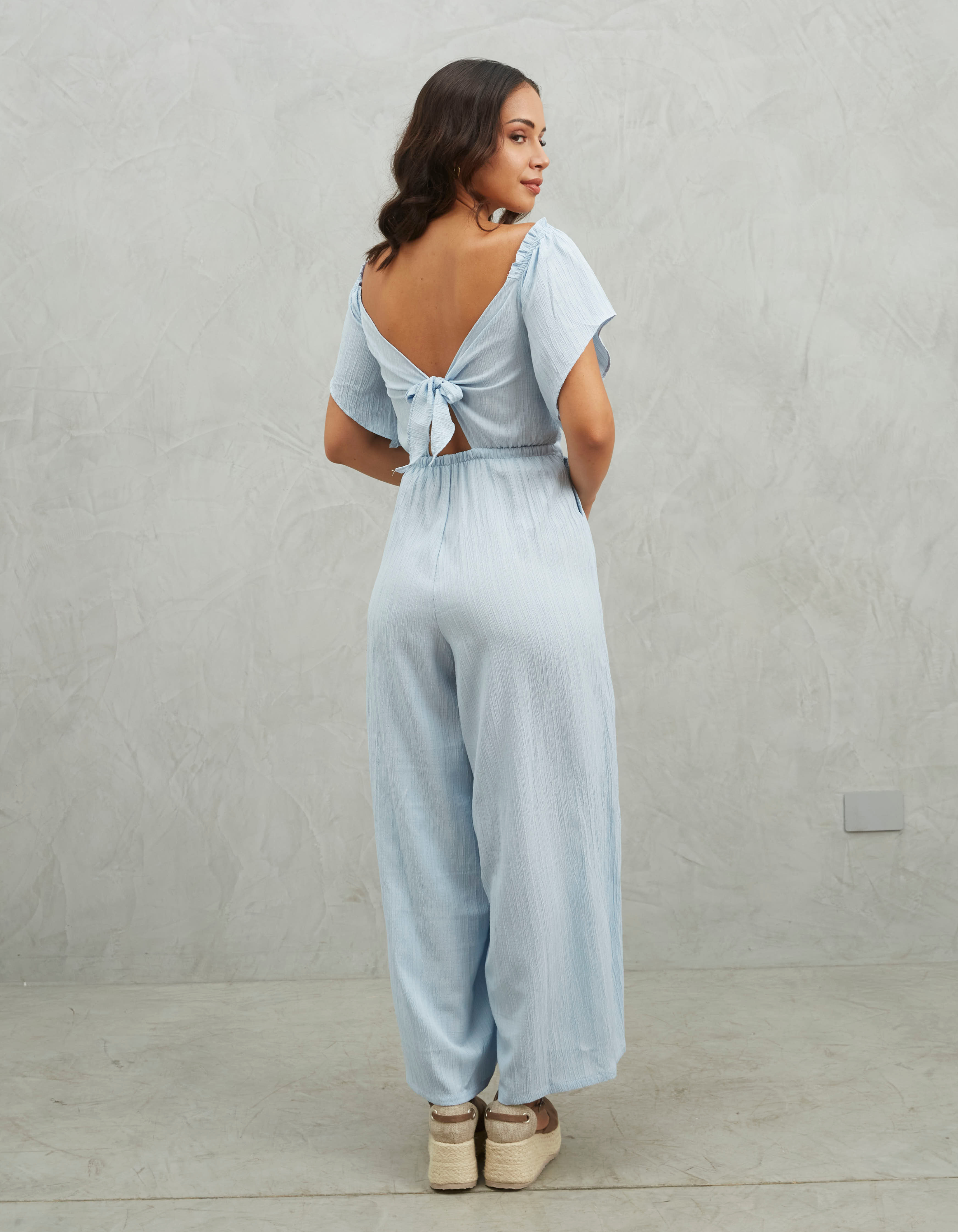 - Enterizo off shoulder con bobitos en las mangas nudo en el centro y lazo en la espalda. Pantalón palaso con bolsillo y abertura culote.