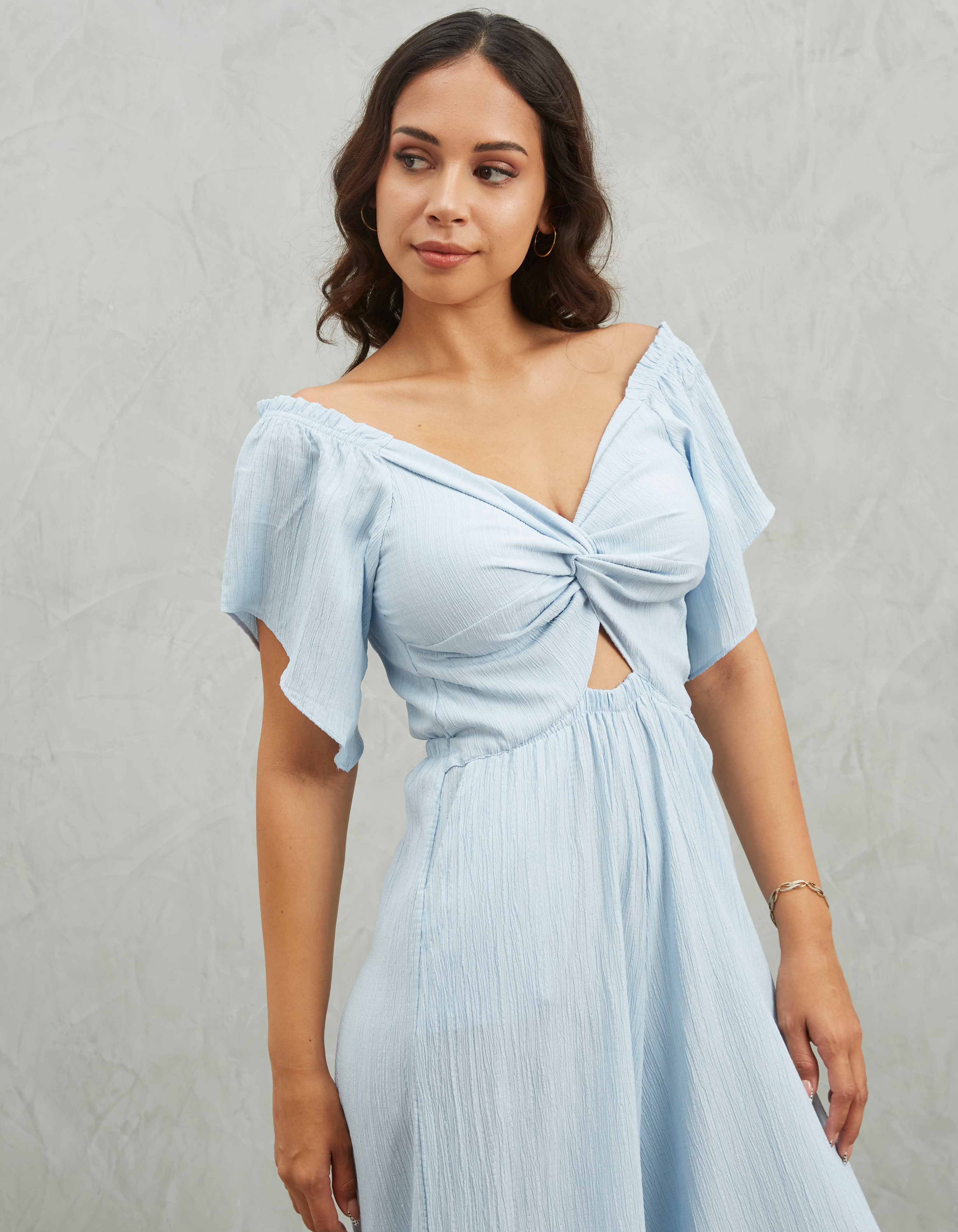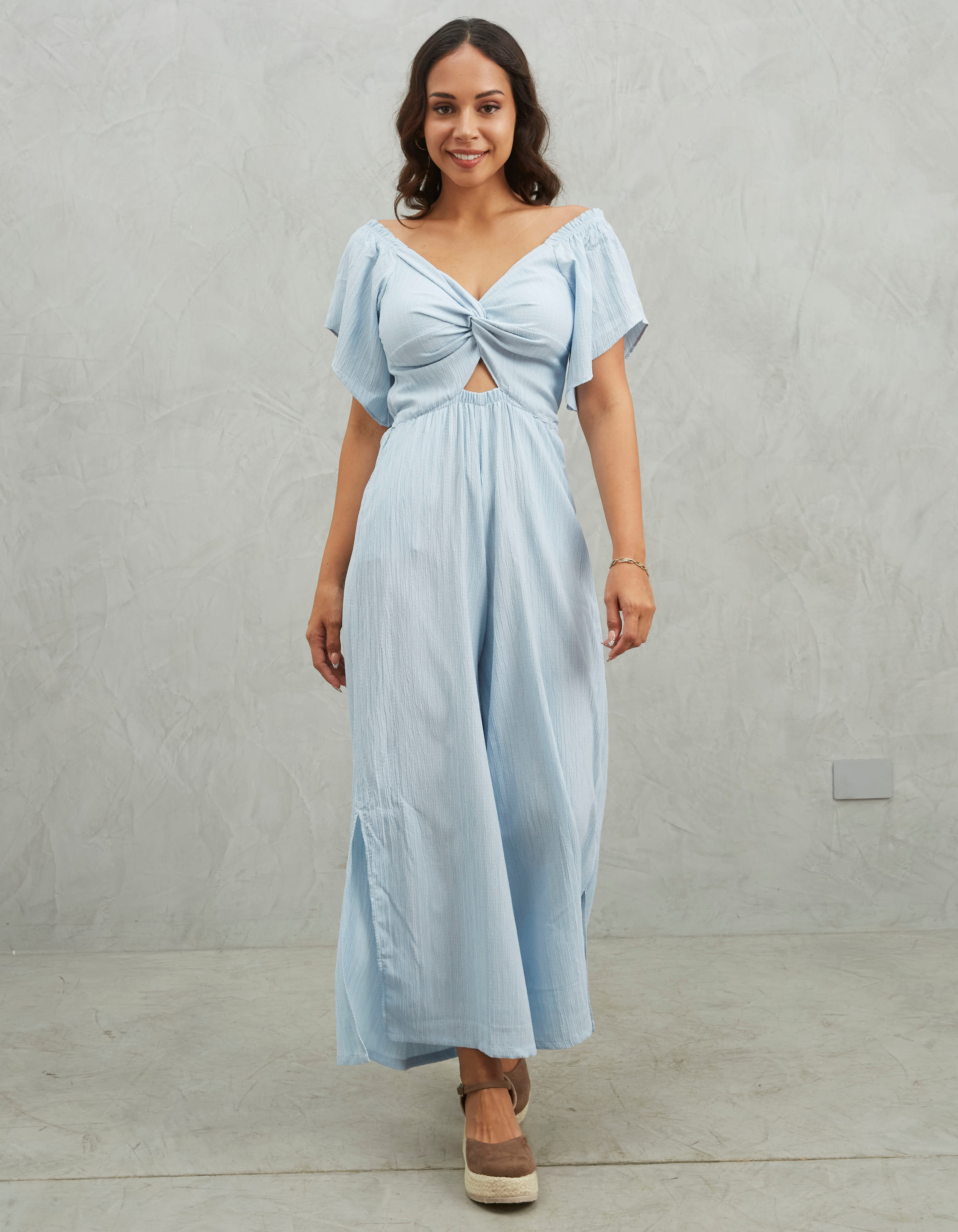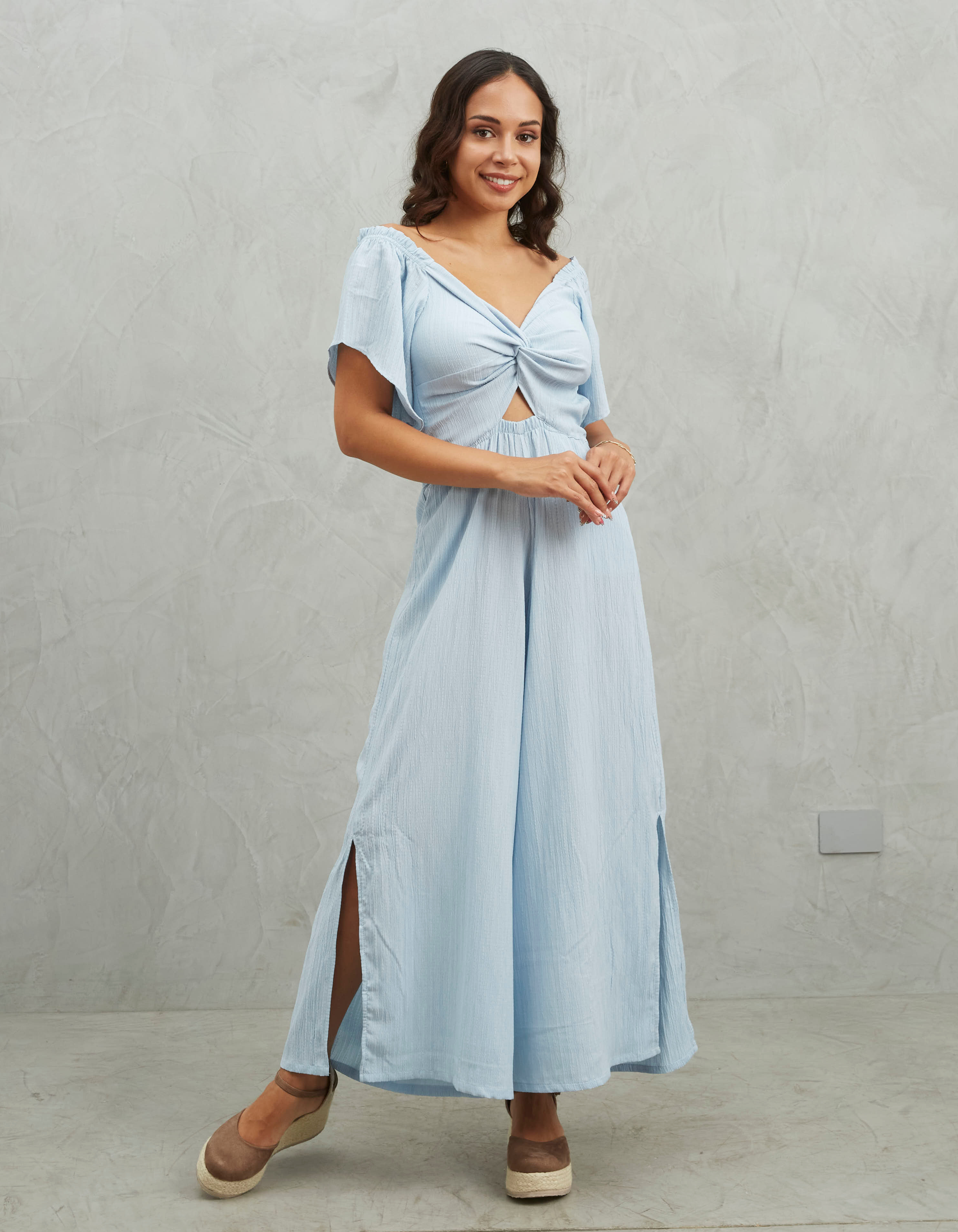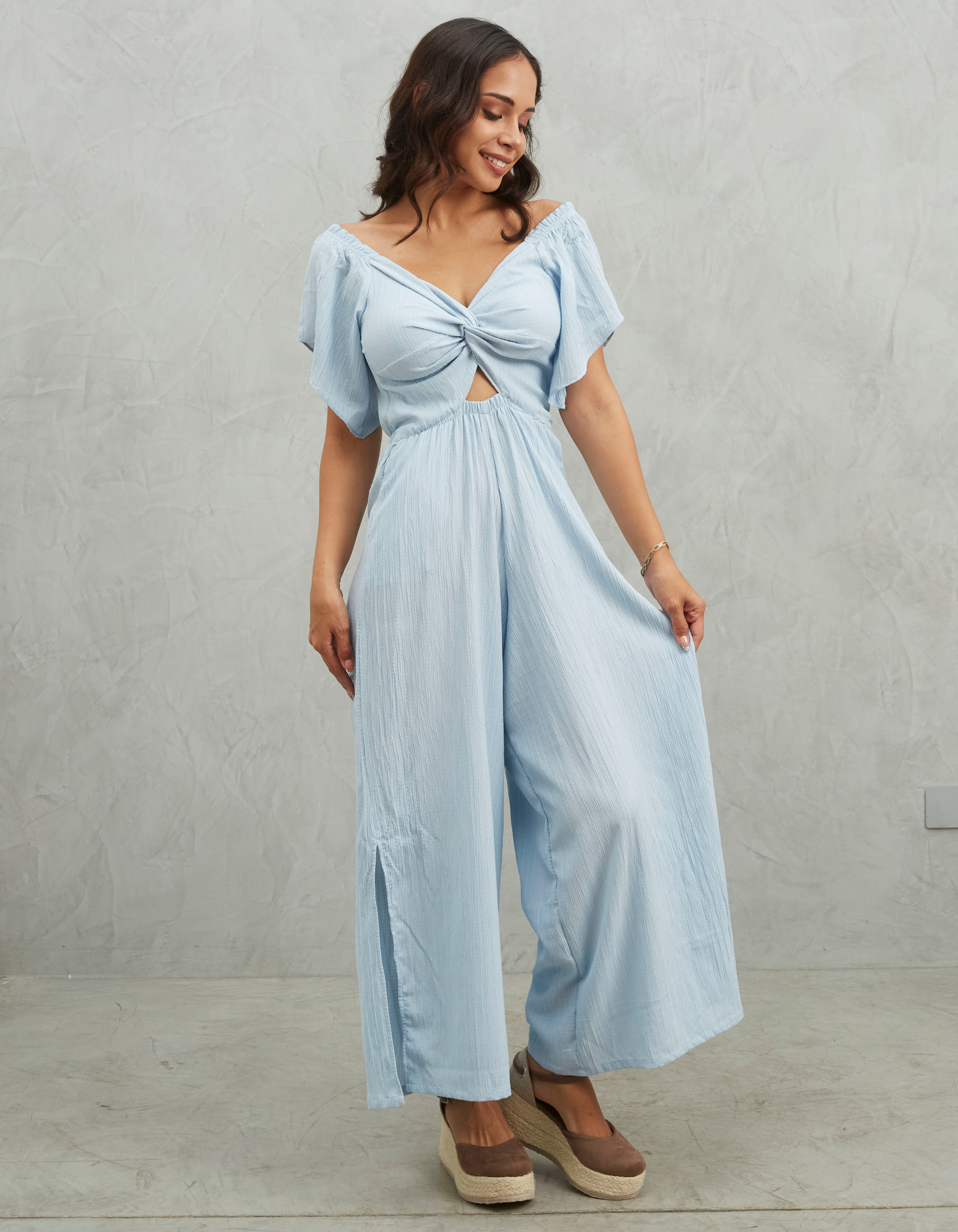 - Enterizo off shoulder con bobitos en las mangas nudo en el centro y lazo en la espalda. Pantalón palaso con bolsillo y abertura culote.