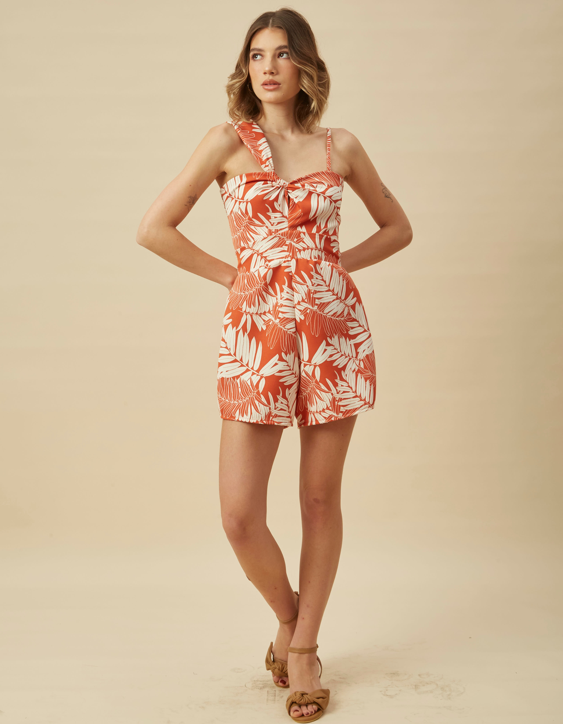 - Enterizo corto con detalle de nudo, tira con regulador, y multielástico en la espalda.