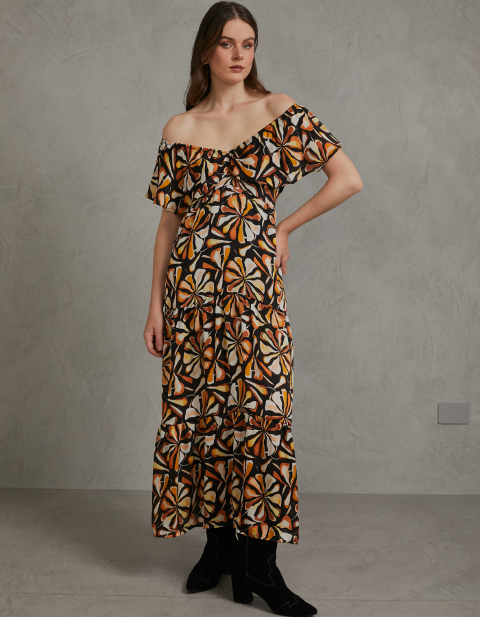 - Maxivestido con elástico y bobos con detalle, falda con fruncidos en 3 tiempos.