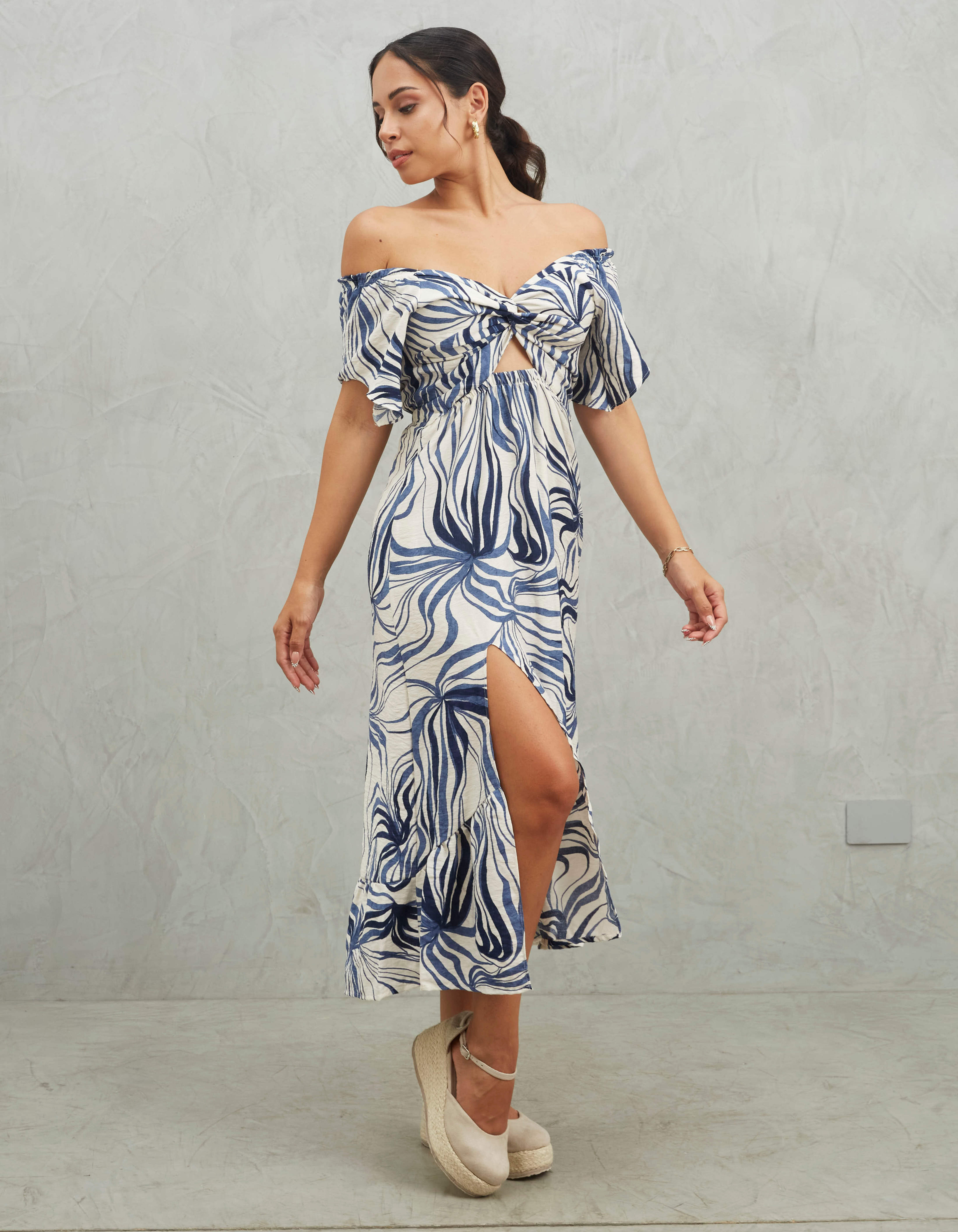 - Vestido off shoulder con bobitos en las mangas nudo en el centro y lazo en la espalda. Falda con abertura en la pierna y detalle de fruncido en la basta.