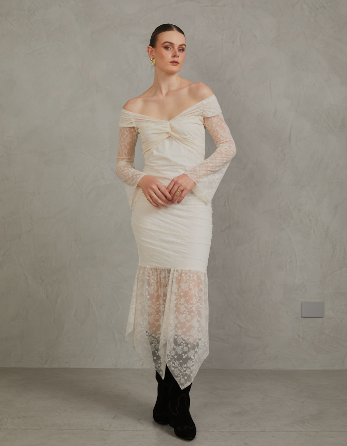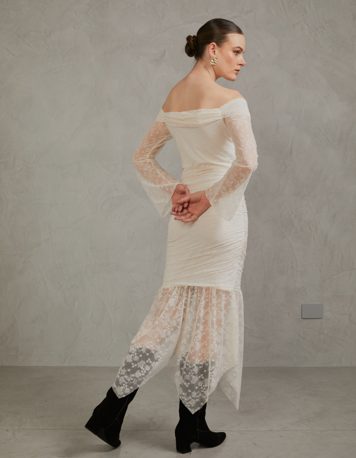 - Vestido bohoo de tull con encaje, off shoulder, forro interno y bobos en puntas.