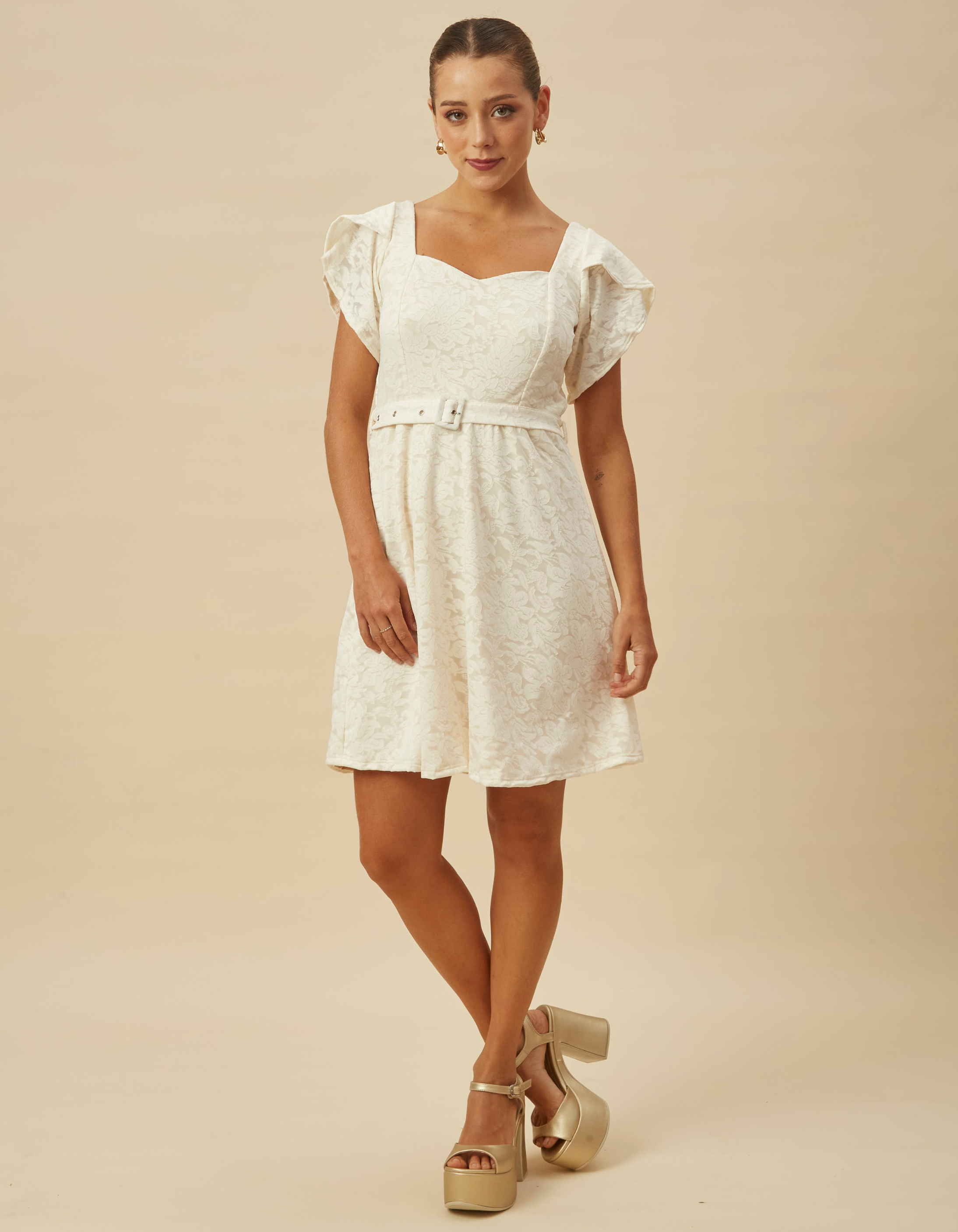- Vestido corset corto de encaje licrado, con mangas de tulipán y correa forrada.