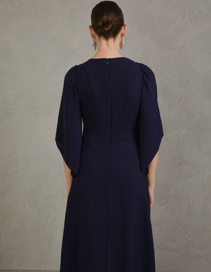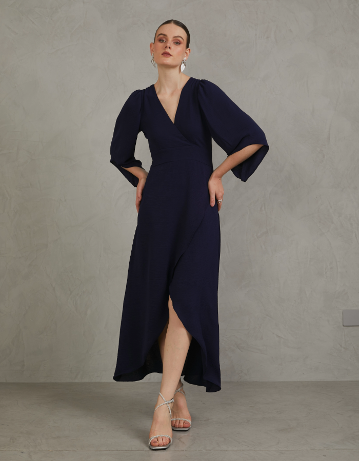 - Vestido cruzado con mangas, falda cruzada, y cierre en la espalda.