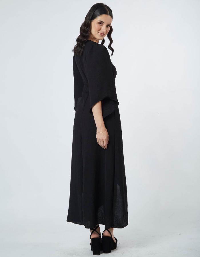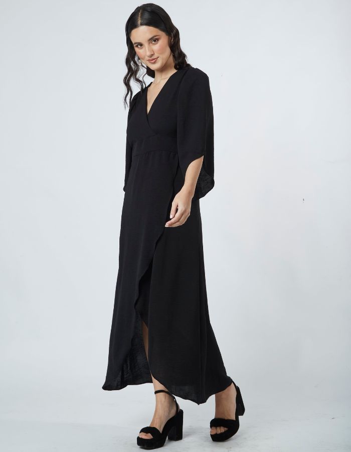 - Vestido cruzado con mangas, falda cruzada, y cierre en la espalda.