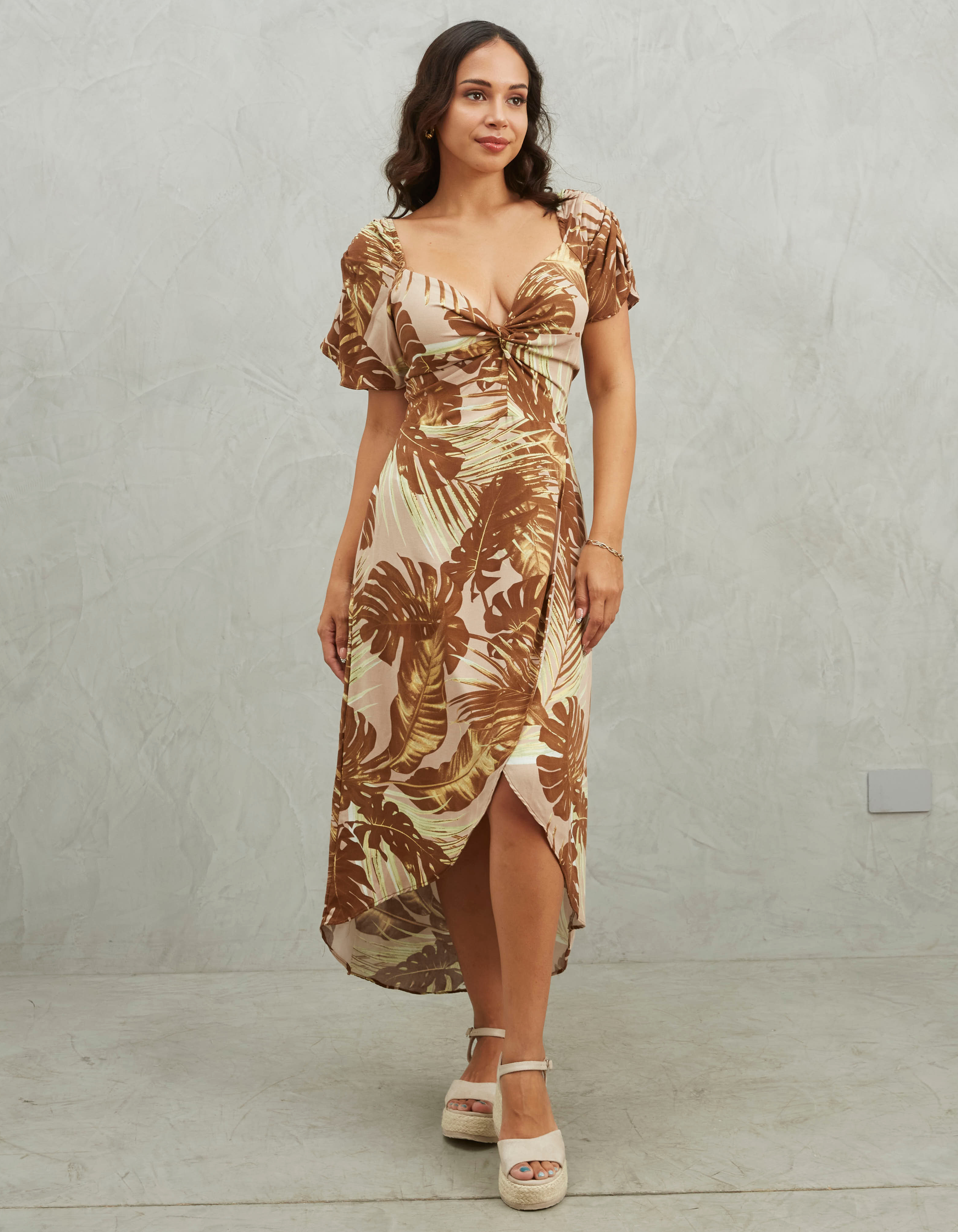 - Vestido con mangas con detalle, nudo en el centro y cruce de falda. Multielástico en la espalda.