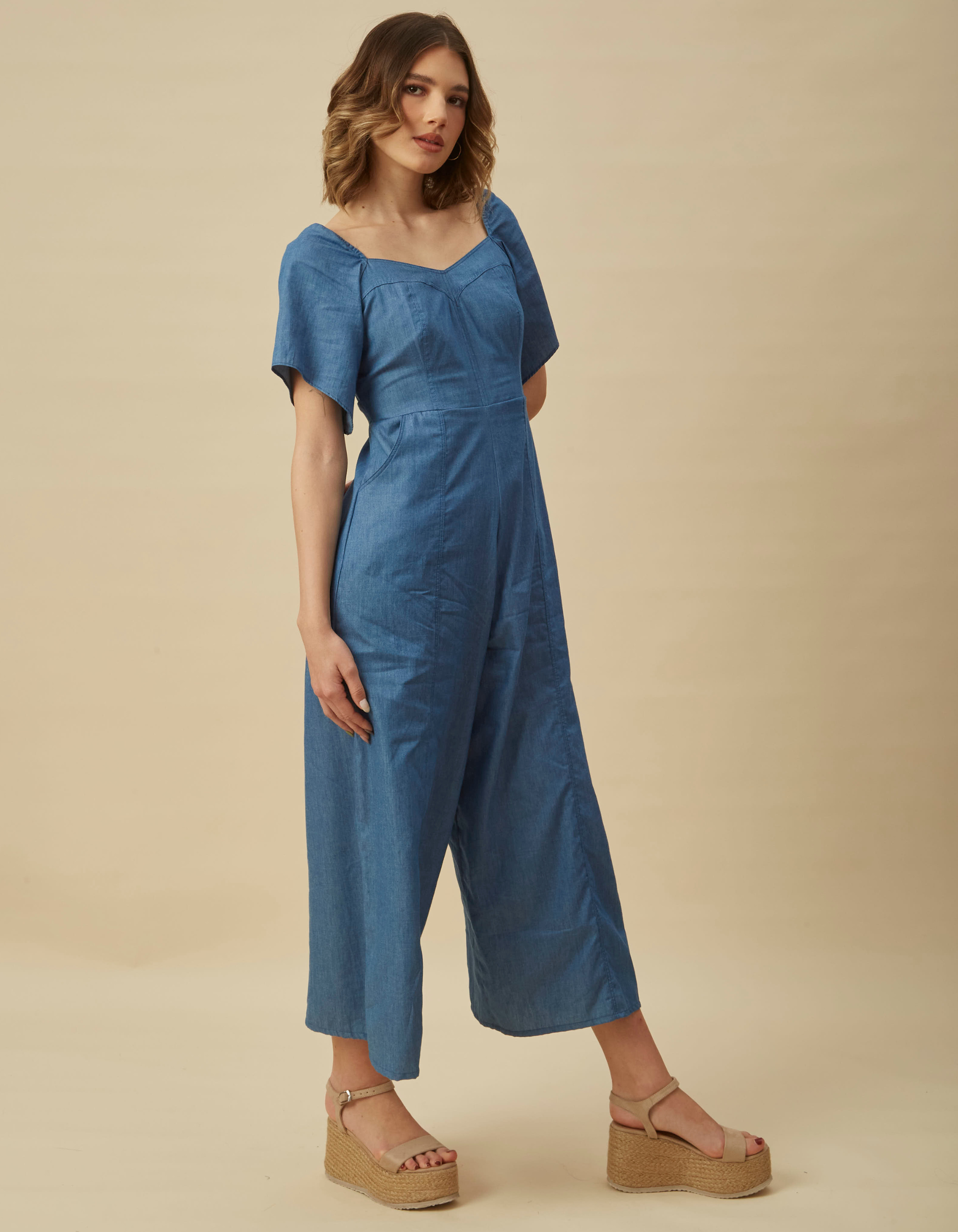 - Enterizo corset con detalles en el pecho, mangas 3/4, pantalón palaso y cierre en la espalda.