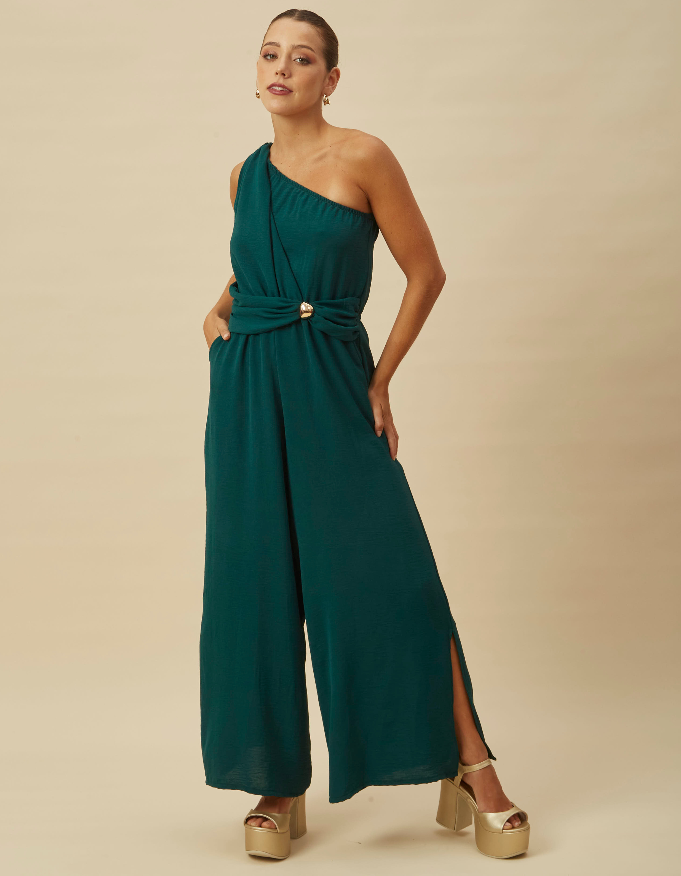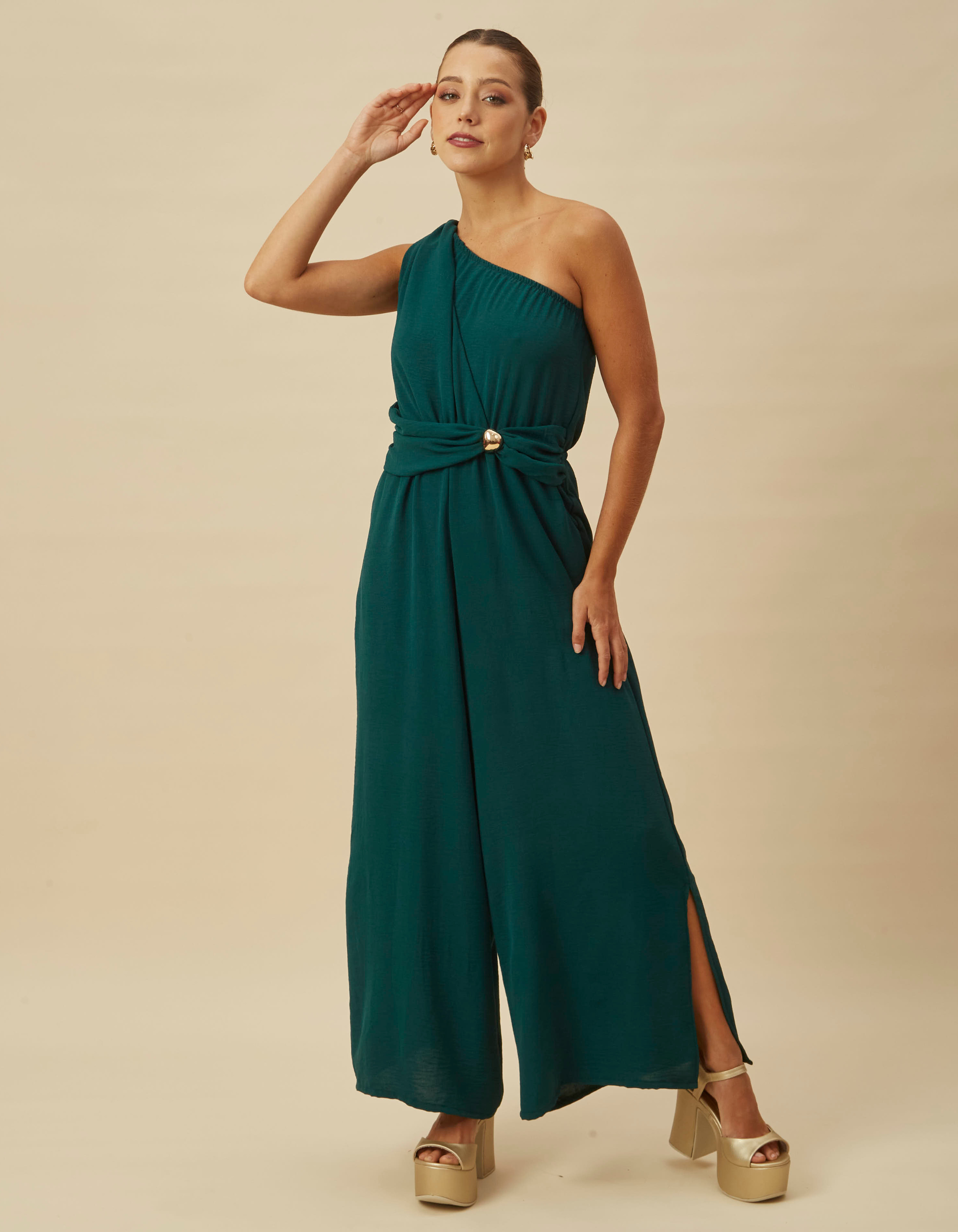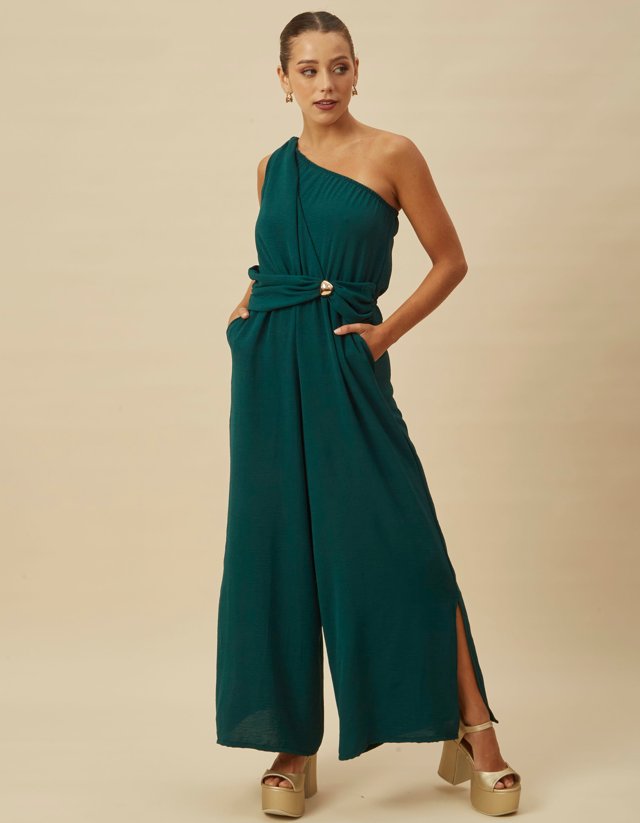 - Enterizo asimétrico con pliegues diagonales y verticales, detalle de aro dorado en la esquina, pantalón palaso con bolsillos y aberturas culotte.