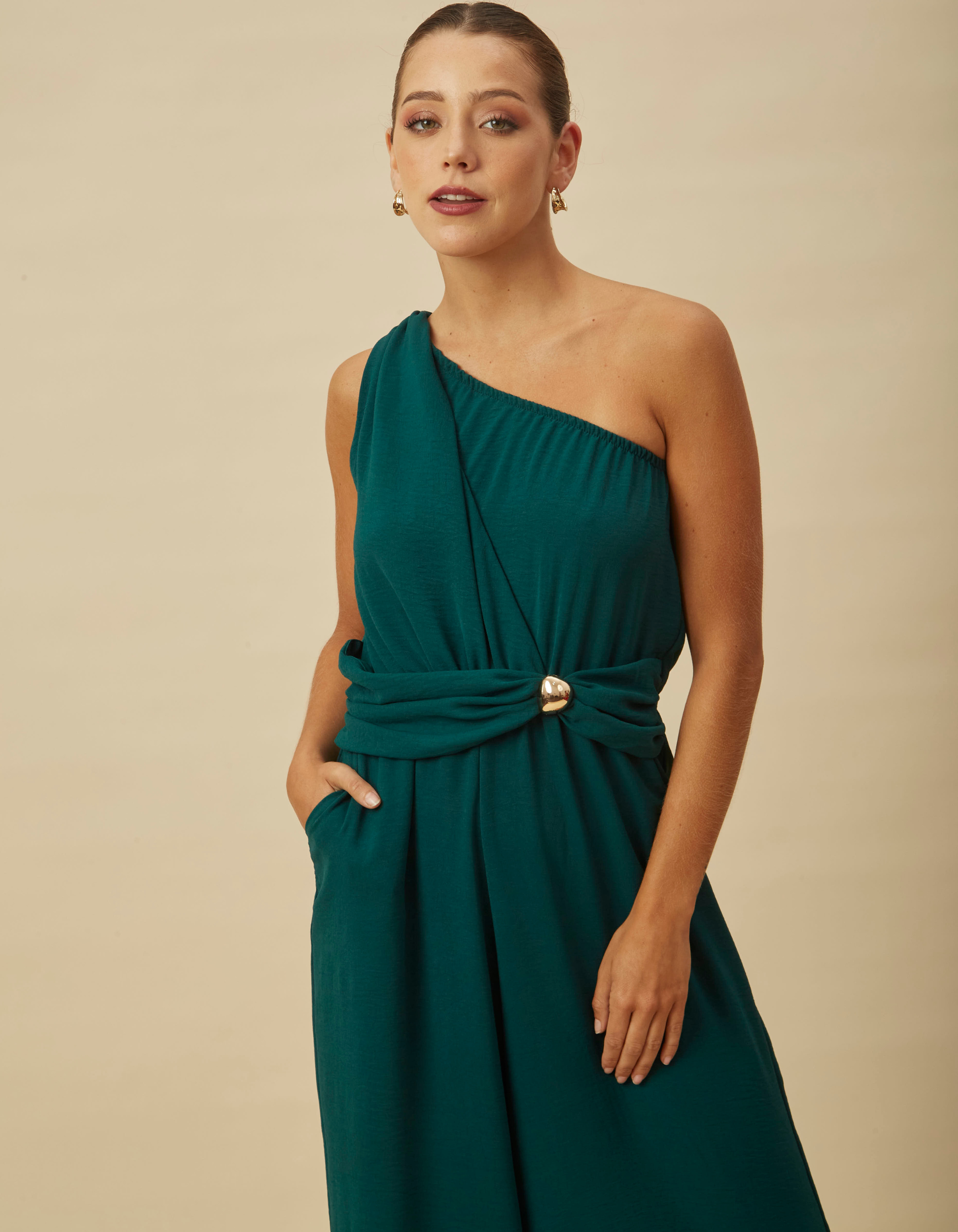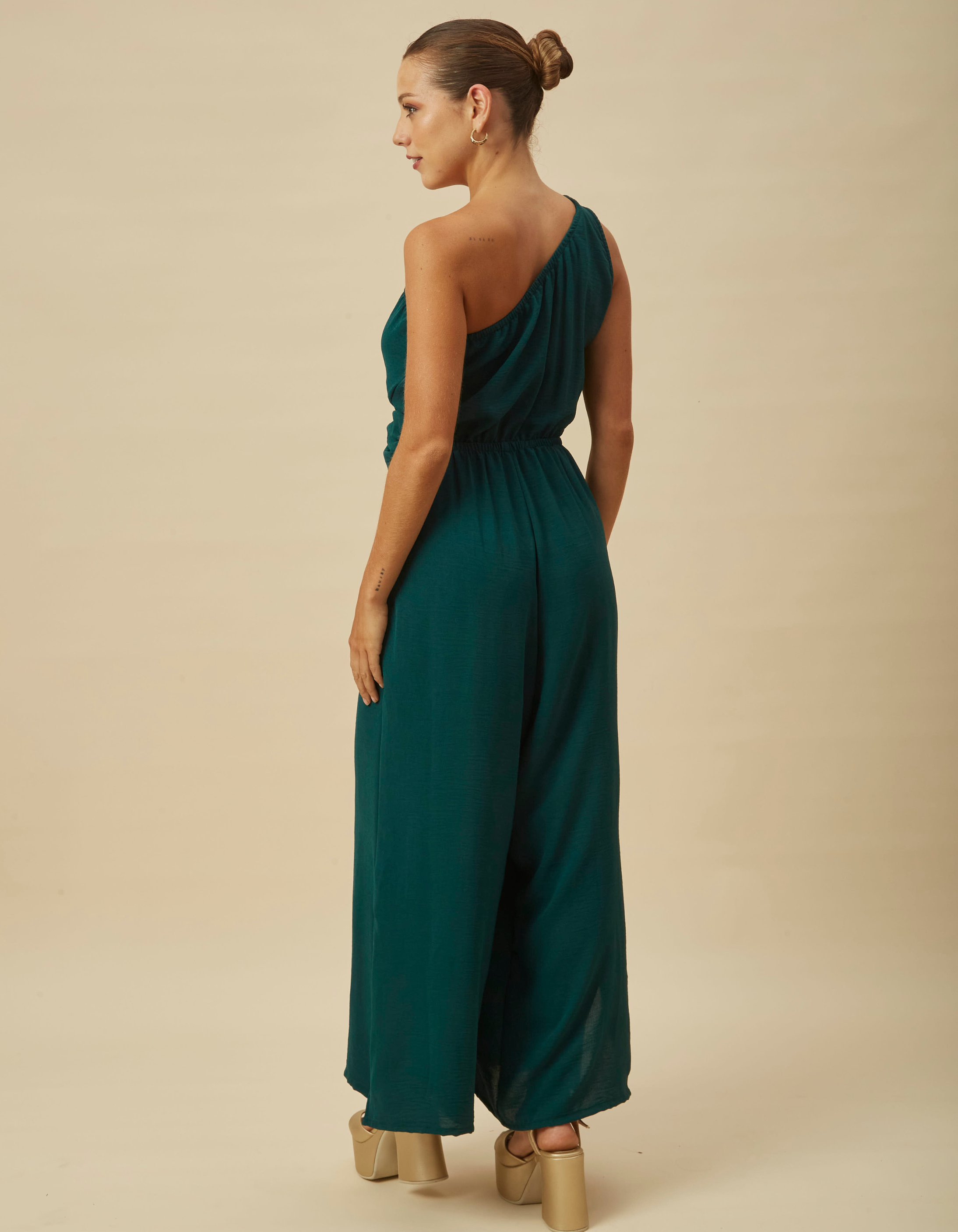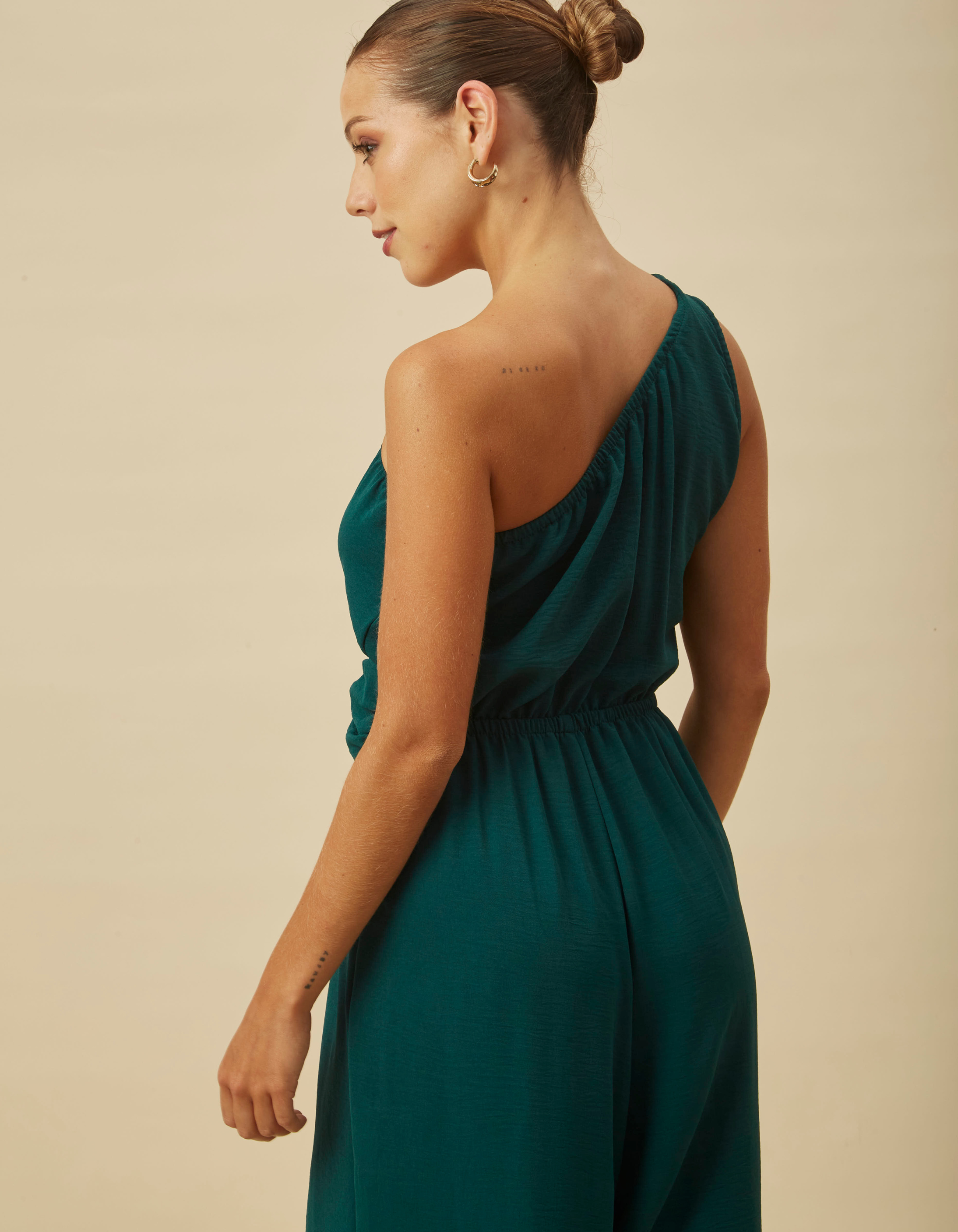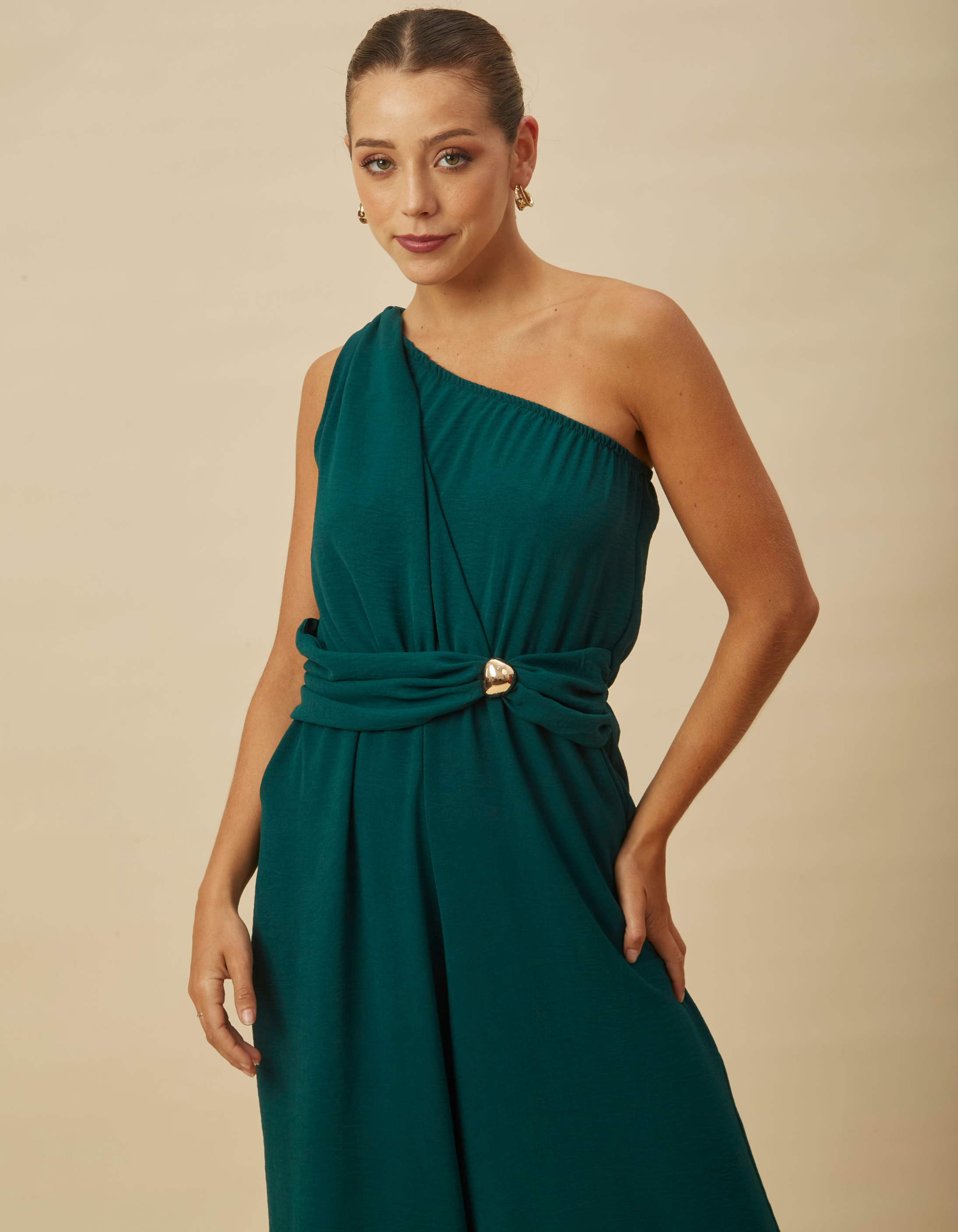 - Enterizo asimétrico con pliegues diagonales y verticales, detalle de aro dorado en la esquina, pantalón palaso con bolsillos y aberturas culotte.