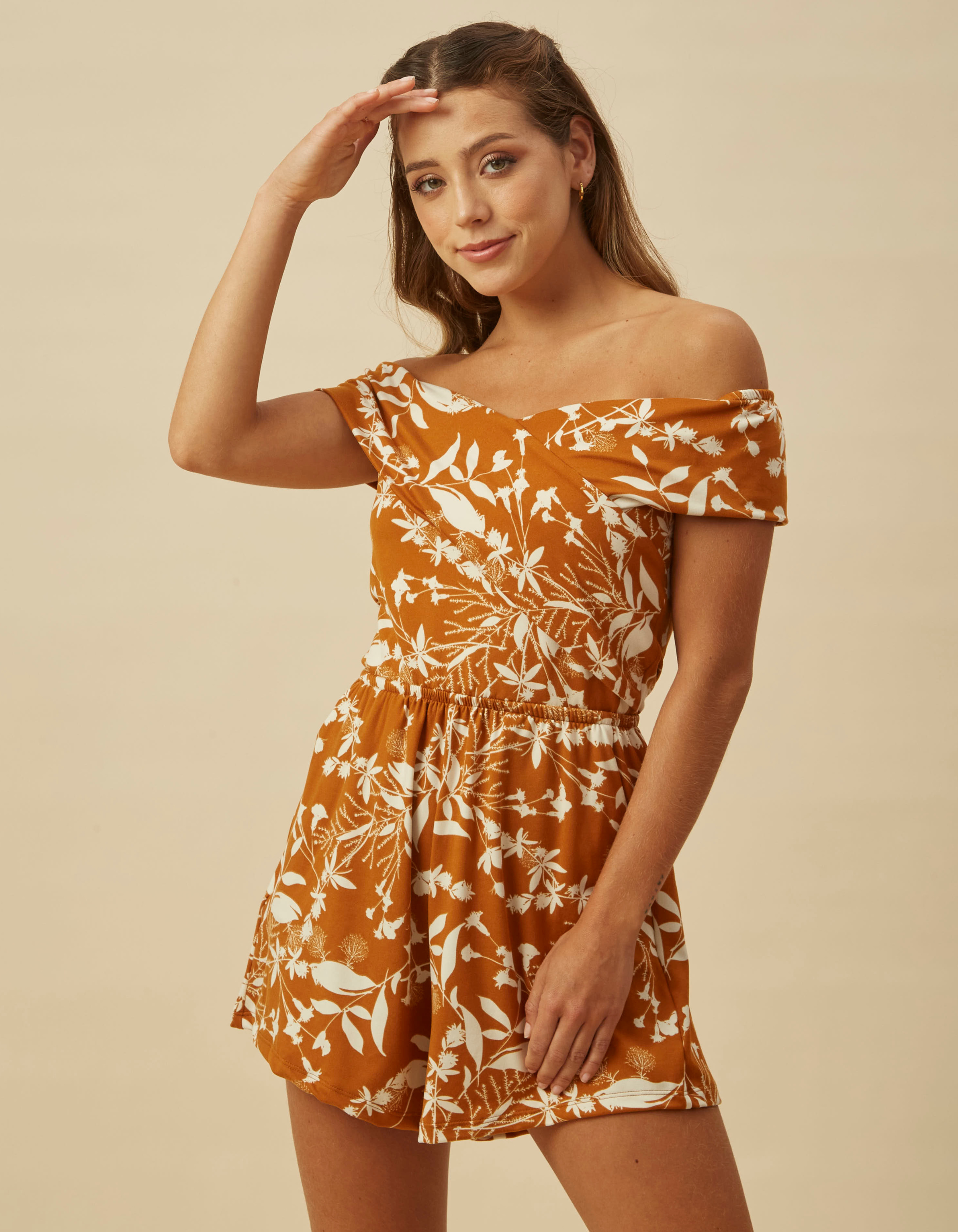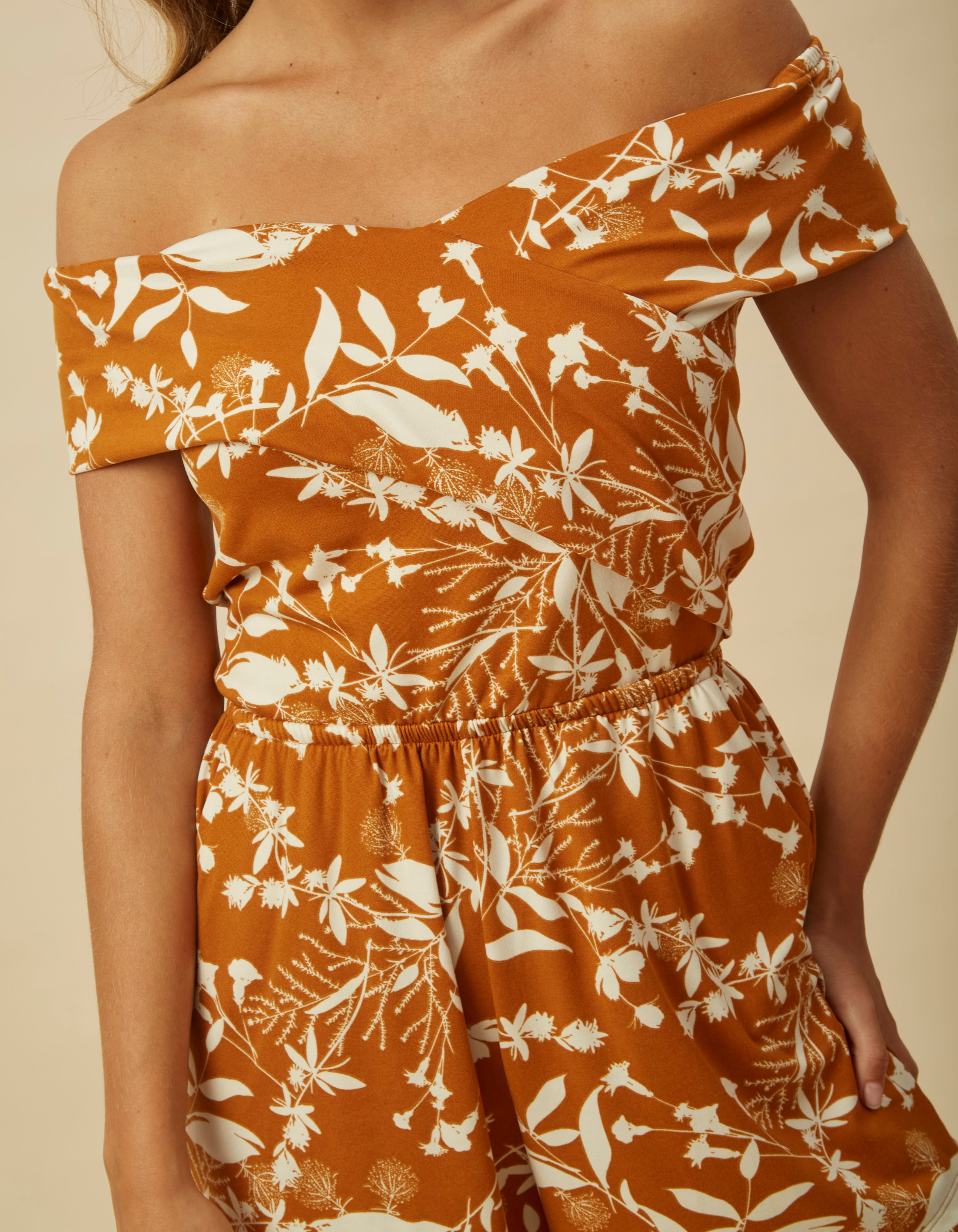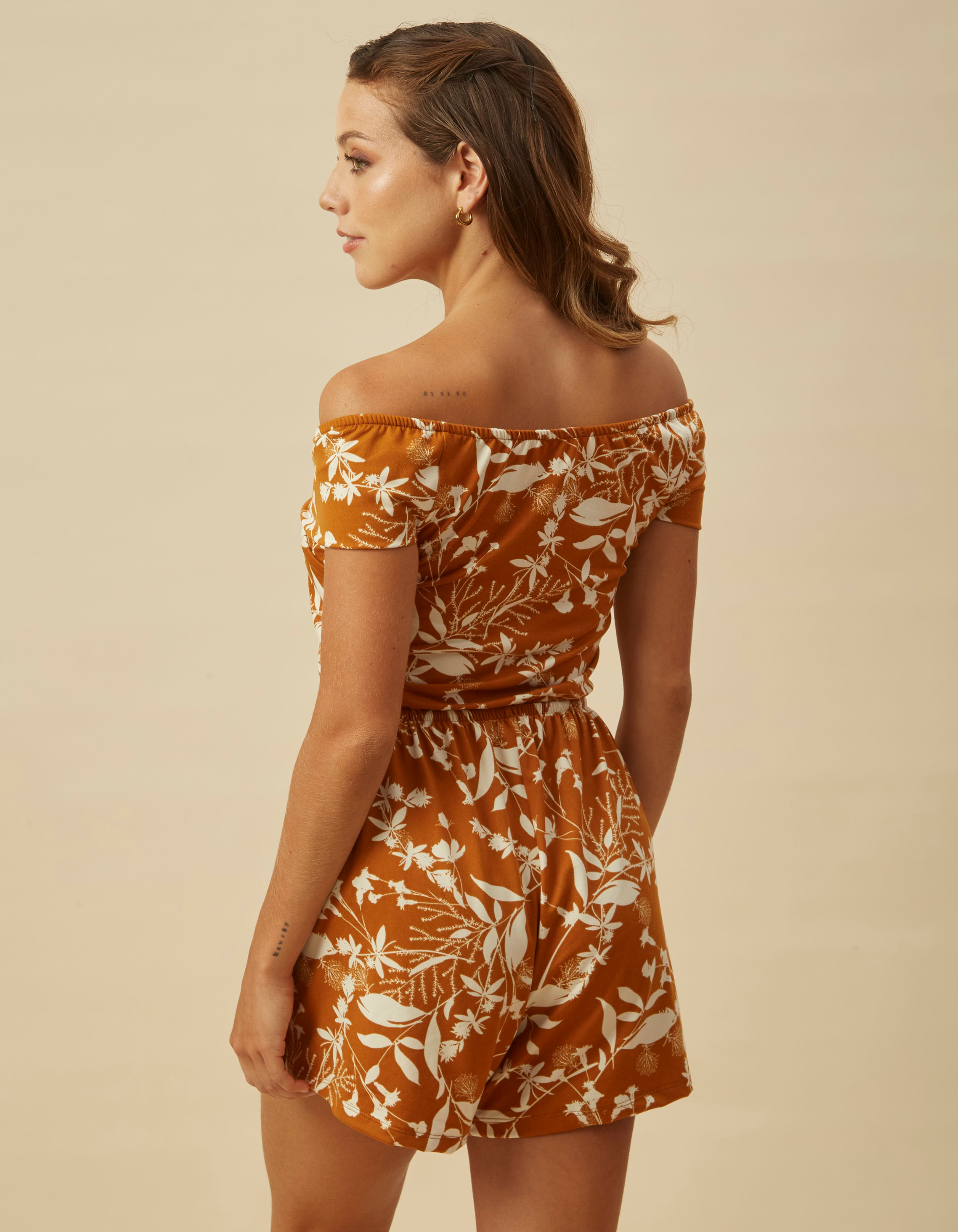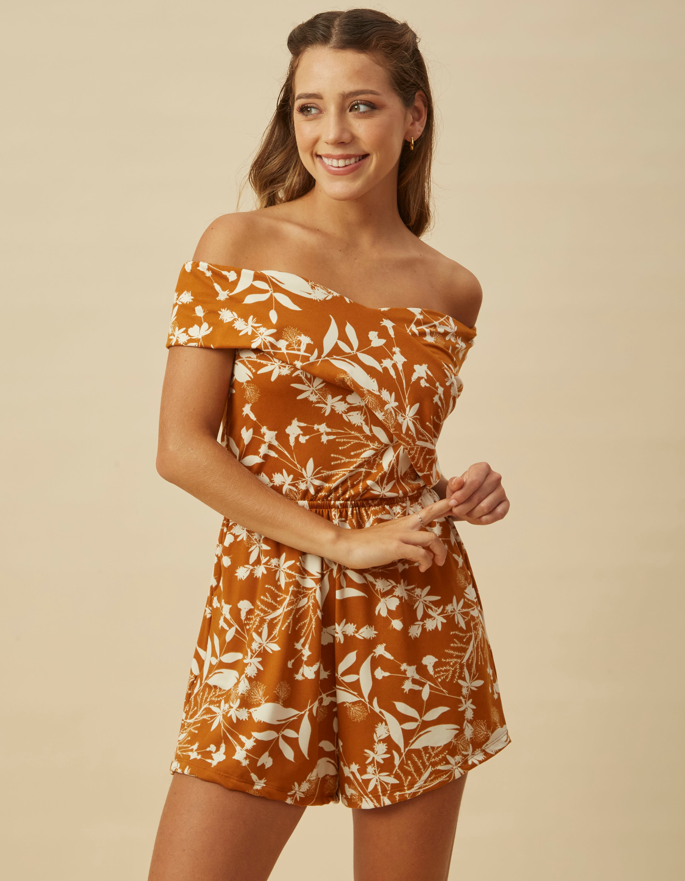 - Enterizo off shoulder cruzado en la parte superior, elástico en la cintura bolsillos y short holgado.