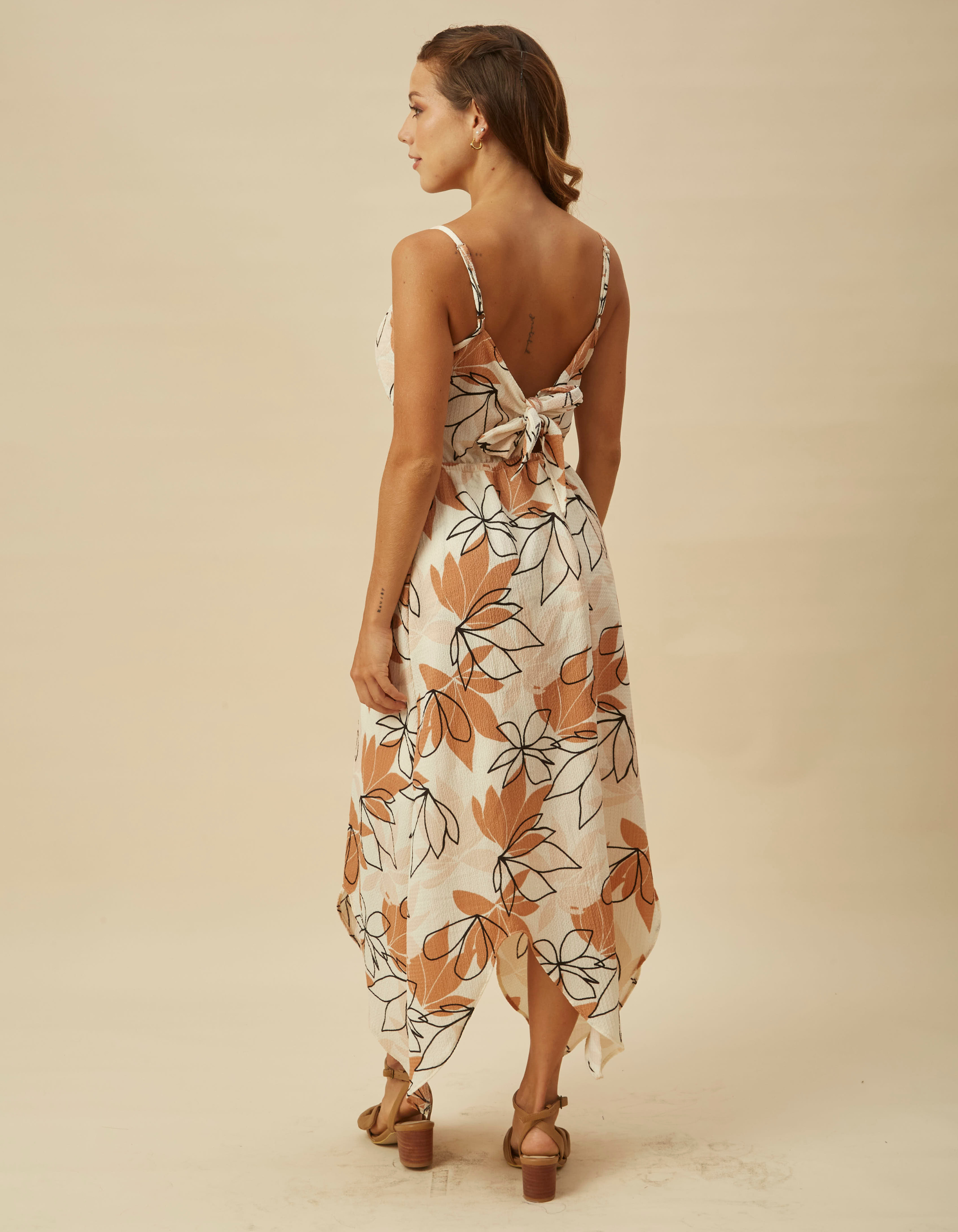 - Vestido largo con detalle en puntas diagonales en la basta. Parte delantera cruzada con pitas regulables y lazo para amarrar en la espalda.